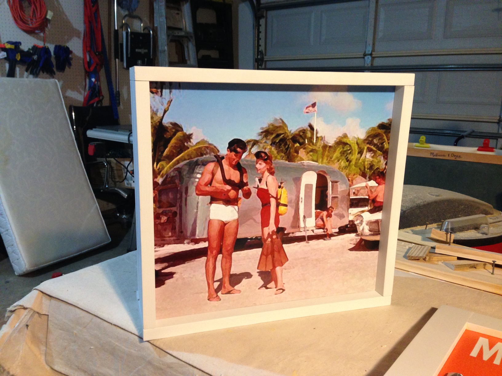 For the photo, I took an old Airstream ad and ran it through Photoshop to give it the look of a painting, had it printed on photo paper and glued it to the back of the plywood panel that makes the rear of the box. Instead of building shelves into the spice rack side, we decided to just sit bottles and use magnetic spice containers from Crate and Barrel.