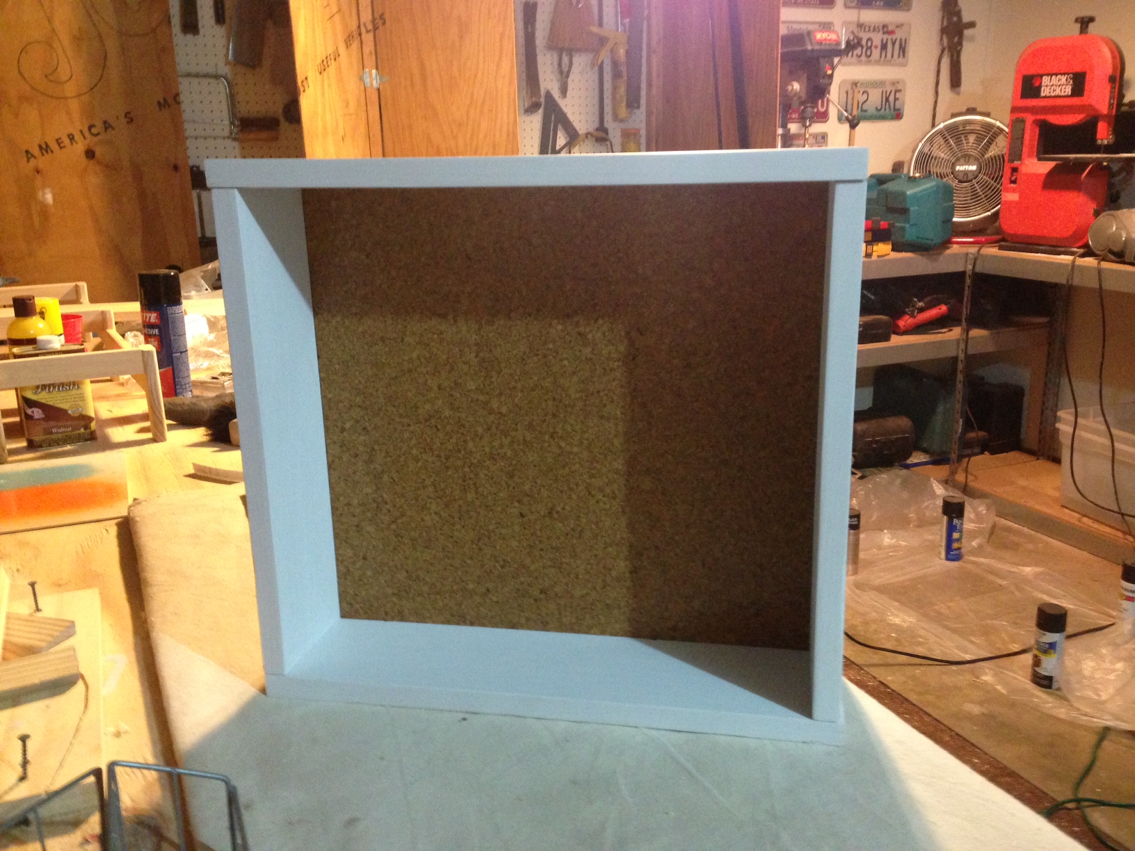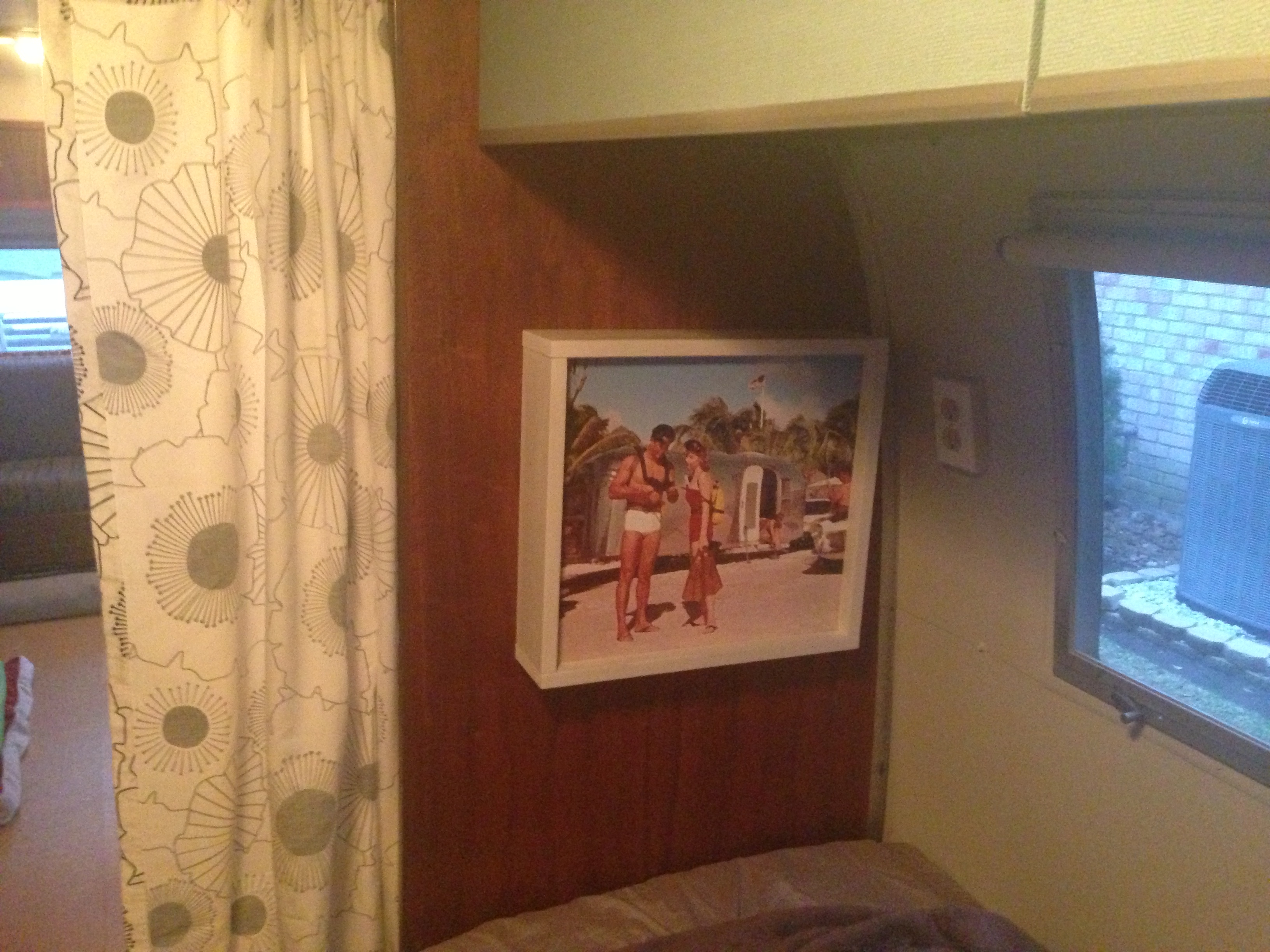 We thought about simply putting a corkboard over the kitchen side and a picture on the bed side, but ultimately decided to do something a little more custom. I built a spice rack and mounted a photo on the back to add interest to the bed side. I cut a groove around all four outside edges of the spice rack box and assembled and glued it directly into the hole for a clean look without having to add additional trim boards, etc. to hold it into place.